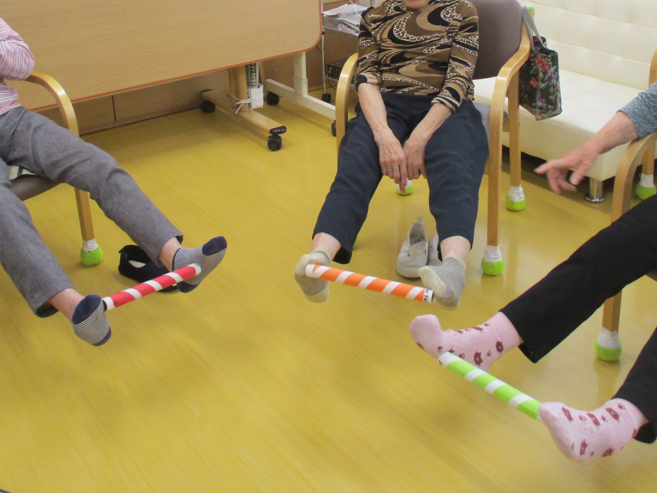 体を動かす体操では、セラバンドや棒を使って無理なく全身をほぐします。